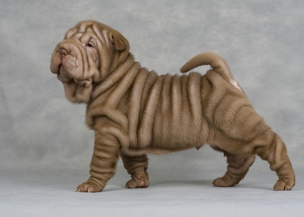 "Chinese Shar-Pei puppies are truly one-of-a-kind, known for their distinctive wrinkled skin, 'hippopotamus' head, and gentle, loyal nature. Originally bred as guardians and hunters, they possess a calm and independent demeanor. These puppies are intelligent and require consistent, patient training to thrive.